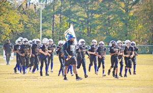 Coach Kenny Rich guides the Loris Recreation Department 12U football team onto the field, proudly carrying the Loris Lions flag to promote their enthusiasm for the game.