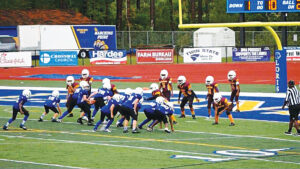 The Loris Rec 12U team strategizes their play as quarterback Rylan Mishoe looks for an opening to take the ball between the goal posts.