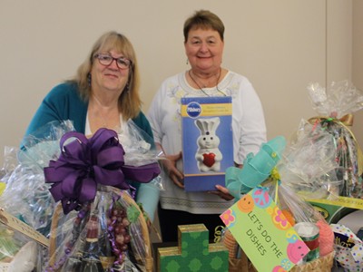 Peggy Merck and Christine Kleczkowski gathered some of the door prizes donated for the annual Mega Card Party/Luncheon at Our Lady Star of the Sea Catholic Church.