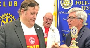 At the past meeting of the Rotary Club of Little River, Marty Richardson, left, was recognized as a Major Donor of the Rotary Foundation. Past District Governor Bernie Riedel, right, made the trip from Hilton Head Island to present Marty with his recognition from Rotary International. Past District Governor Bart Mahoney is in the background.