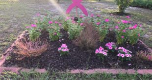 If you drive down 11th Avenue North in North Myrtle Beach late in the afternoon as the sun begins to set, look to the Yaupon Garden Club School yard garden fronting the Ocean Drive Elementary School. The members recently followed the suggestion of the South Atlantic Region, Garden Clubs of America, to extablish a “Plant it Pink”. This garden is the hope that the residents and tourists will be reminded of the ongoing fight against breast cancer in our families and communities. As the picture was snapped a ray of sunshine reminds us to think positively and never give up …