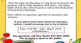 The North Myrtle Beach Republican Club will be hosting a forum on May 9th starting at 7:00 PM at Boulineau’s in NMB. The speakers will be Holly Heniford, Neil James, Helen Smith all from the school board as well as Ken Richardson School Board Chairman. Contact: Cleo Steele @843-907-3090 Come out get involved!