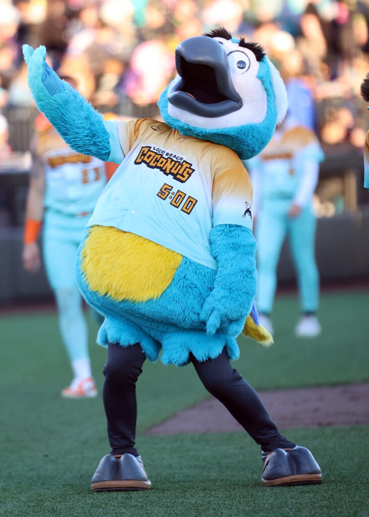 Loco Beach Coconuts mascot Peter Colada gets the sold-out crowd fired up at Coastal Carolina University.