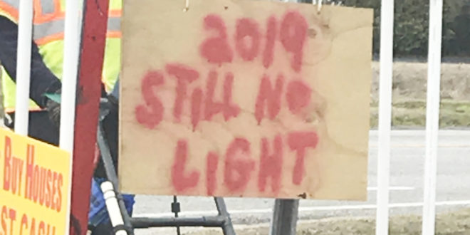 A handwritten sign on Highway 57 at the intersection of Highway 111 and Little River Road in Brooksville, reading, “2019. Still no light,’’ vents locals frustration, but South Carolina House of Representative William Bailey of Little River said that the funding is now secure for a light, though it still may take some months.