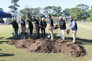 Groundbreaking for the Central Park Pickleball Complex was held last Saturday morning. Turning over the first shovels of dirt for the project were, left to right, Jim Grainger, Operations Manager Parks and Public Grounds; Mayor Pro Tem J. Baldwin; Darry Del Corro; City Manager Ryan Fabbri; Mayor Marilyn Hatley; Councilman Trey Skidmore; Councilman Bubba Collins; and Director of Parks and Recreation Matt Gibbons.