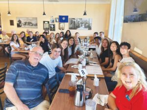 Visiting students are pictured with Lions chaperones Mike Love and Betsy Keenan, seated at the head of the table.