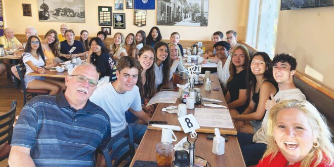 Visiting students are pictured with Lions chaperones Mike Love and Betsy Keenan, seated at the head of the table.