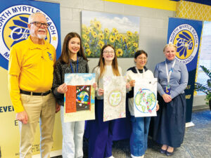 Left to right are Lion Nils Regnell; first place winner Isabella Santos; second place winner Alexandria Johnson; third place winner Sophia Smith; and North Myrtle Beach art teacher Merideth Craven.