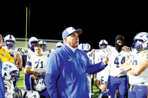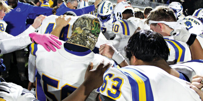 Photos by Kaye Collins Ending the season is always challenging, regardless of the outcome. The Lions share a brotherhood, and the loss on Friday night resulted in tears and disappointment. The coach encourages them to touch a shoulder as Pastor Tommy Shelley from Crossway Church, who has attended every game, practice and traveled to support the team, leads them in prayer before each game. His goal of this prayer was to uplift the spirit of the game in each player’s heart.