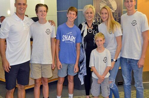 During their October 21 meeting, City Council members recognized Team Shark 843 for its recent team and individual performances at the wakeboard nationals. The successful team represents Shark Wake Park 843 located on the lake at the North Myrtle Beach Park & Sports Complex. Team members appearing at the Council meeting included Charlie Pfahler, Will Hall, Ethan Bellamy, Kyle Bohack, Regan Bohack and Jake Bohack. Mayor Marilyn Hatley joins team members for a celebratory photo.