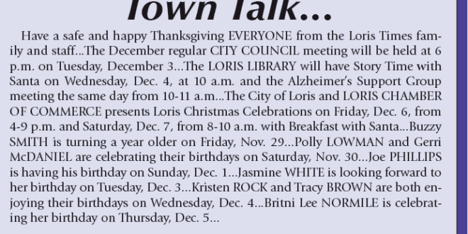 EVERYONE being wished a safe and happy Thanksgiving from the North Myrtle Beach Times family and staff…Plan to view the annual CHRISTMAS PARADE at any location along Main Street in North Myrtle Beach at 5:30 p.m. on Saturday, December 7… Sure hope you are feeling much better by now Mary LOFLIN…Ruth and Brian TITUS preparing for their upcoming Christmas party…An extra special happy 39th wedding anniversary on Friday to Edith Ann and Timmy PHILLIPS…Ruth Ann ELLIS resigning from the North Myrtle Beach Chamber this week after many years of awesome work and she will be missed very much…Make plans to …