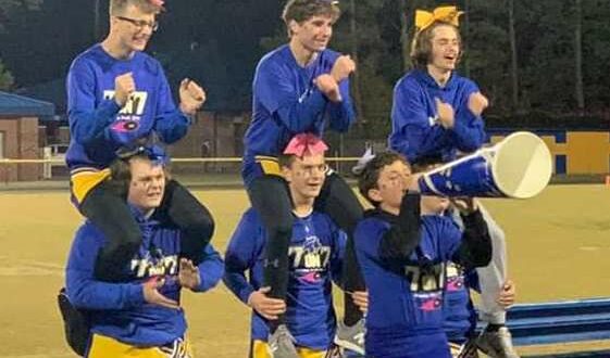 Ashton Norman and Madison Hardwick, the cheering coaches, assisted seven young men to learn the movements and cheers. Norman said,