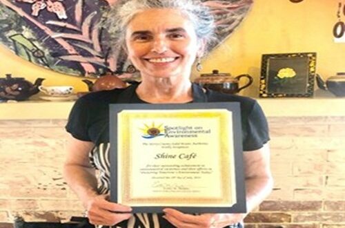 In the kitchen executive chef and owner Leslie Wilson takes great pride and effort in preparing delicious meals with locally and home grown, organic vegetables. Organic food scraps and other compostable materials are composted in the “Gussie Compost Castle” located behind the restaurant. In addition to recycling standard items, i.e., cardboard, glass and metal, etc. they also promote environmental awareness by providing eco-friendly, non-plastic service whether customers are dining in or taking it to go. Shine Café utilizes “real” service ware, i.e., ceramic dishes, cutlery, cloth napkins and glassware in their dining room and plant-based/compostable to go containers for take out orders. Shine Café takes their efforts to another level and utilizes melted ice to water plants, thereby not wasting even a drop of water.
