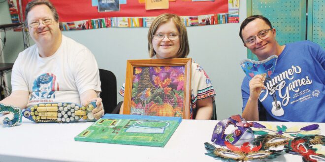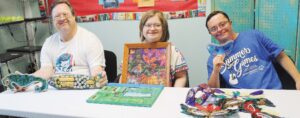 On Saturday, June 7, the Columbiettes of Our Lady Star of the Sea Catholic Church sponsored an arts and crafts festival with vendors who have a cognitive or sensory disability. Pictured, left to right, are Jeremy Williams, Megan Marrero and Luke Ward displaying their items for sale before the festival.
